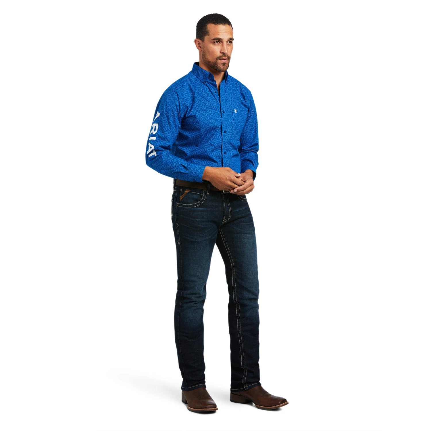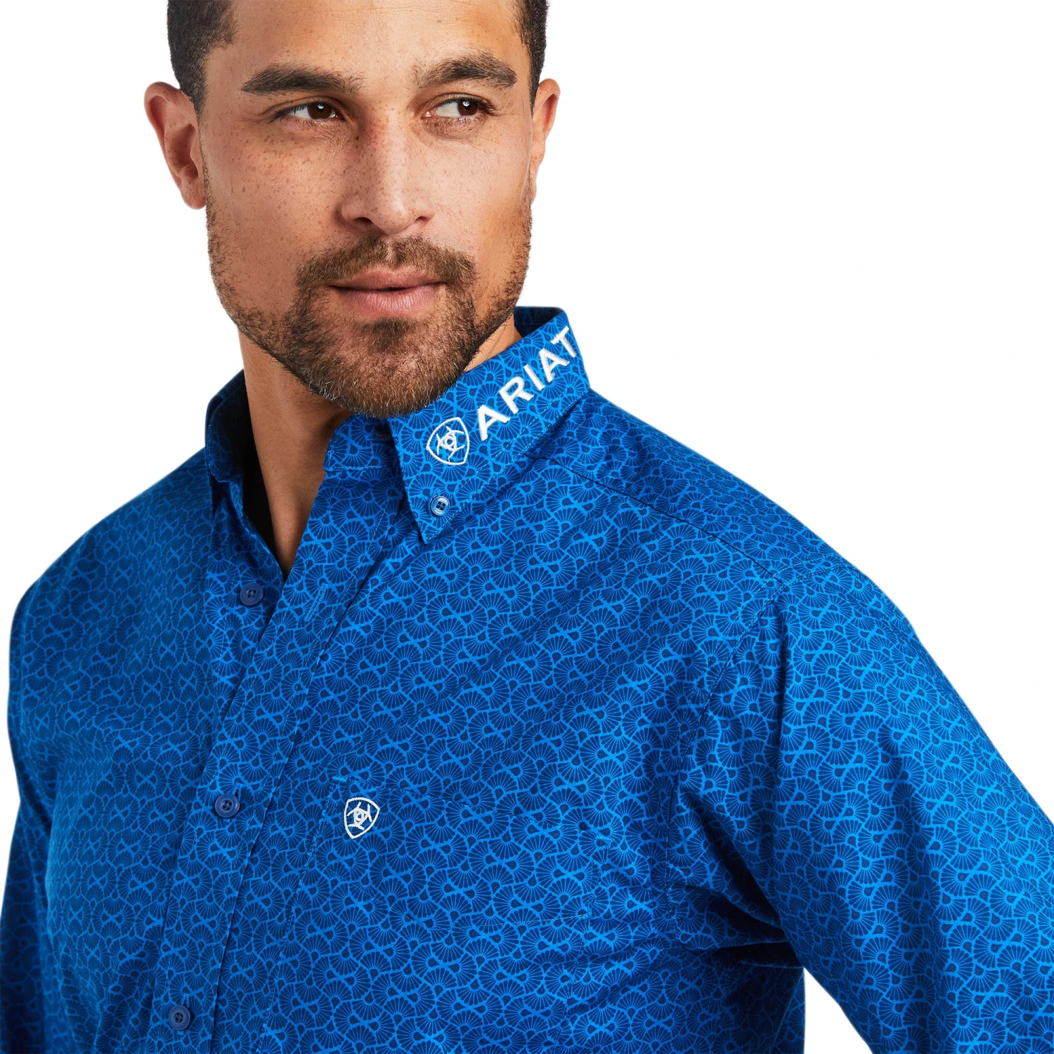 Blue Print Long Sleeve Button Down Shirt with White Logo Embroidery.