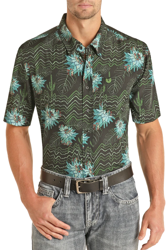 Black with Green and Blue Tropical Print Short Sleeve Button Down Shirt.