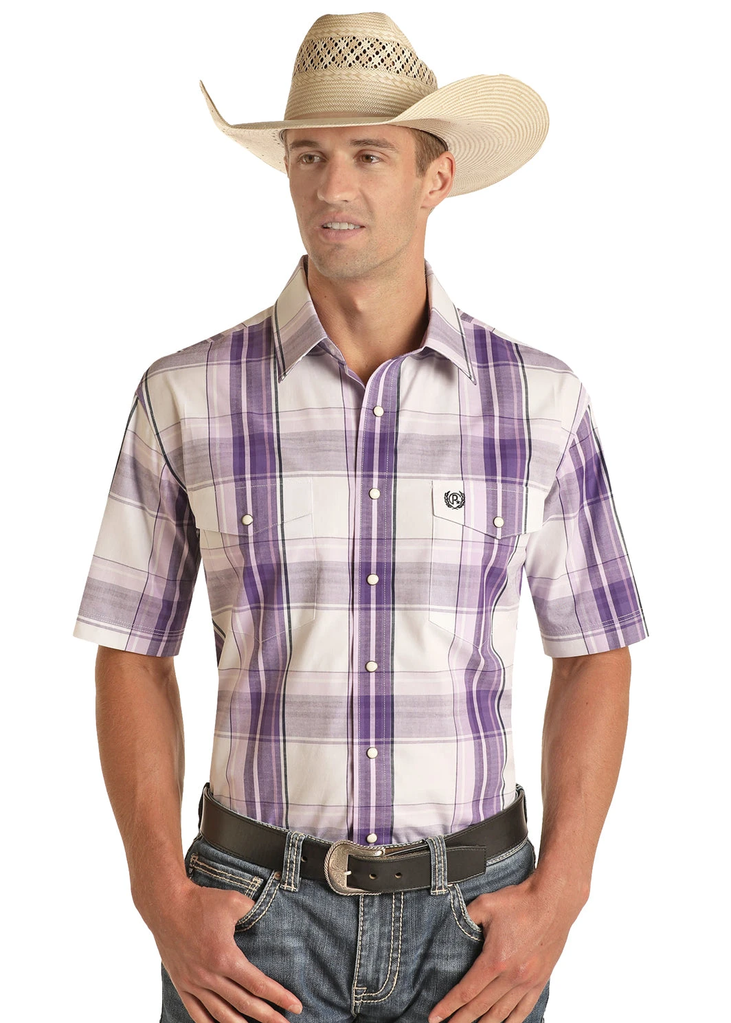 Violet and White Plaid Short Sleeve Snap Front Shirt.