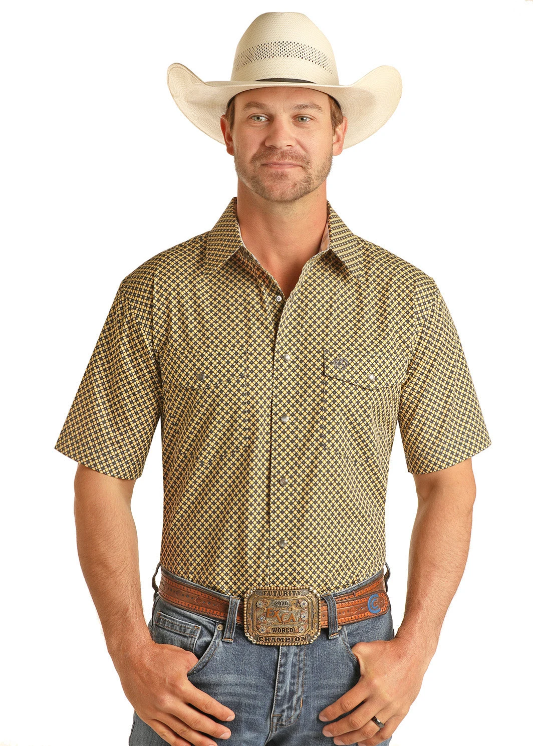 Yellow and Black Plaid Short Sleeve Snap Front Shirt.