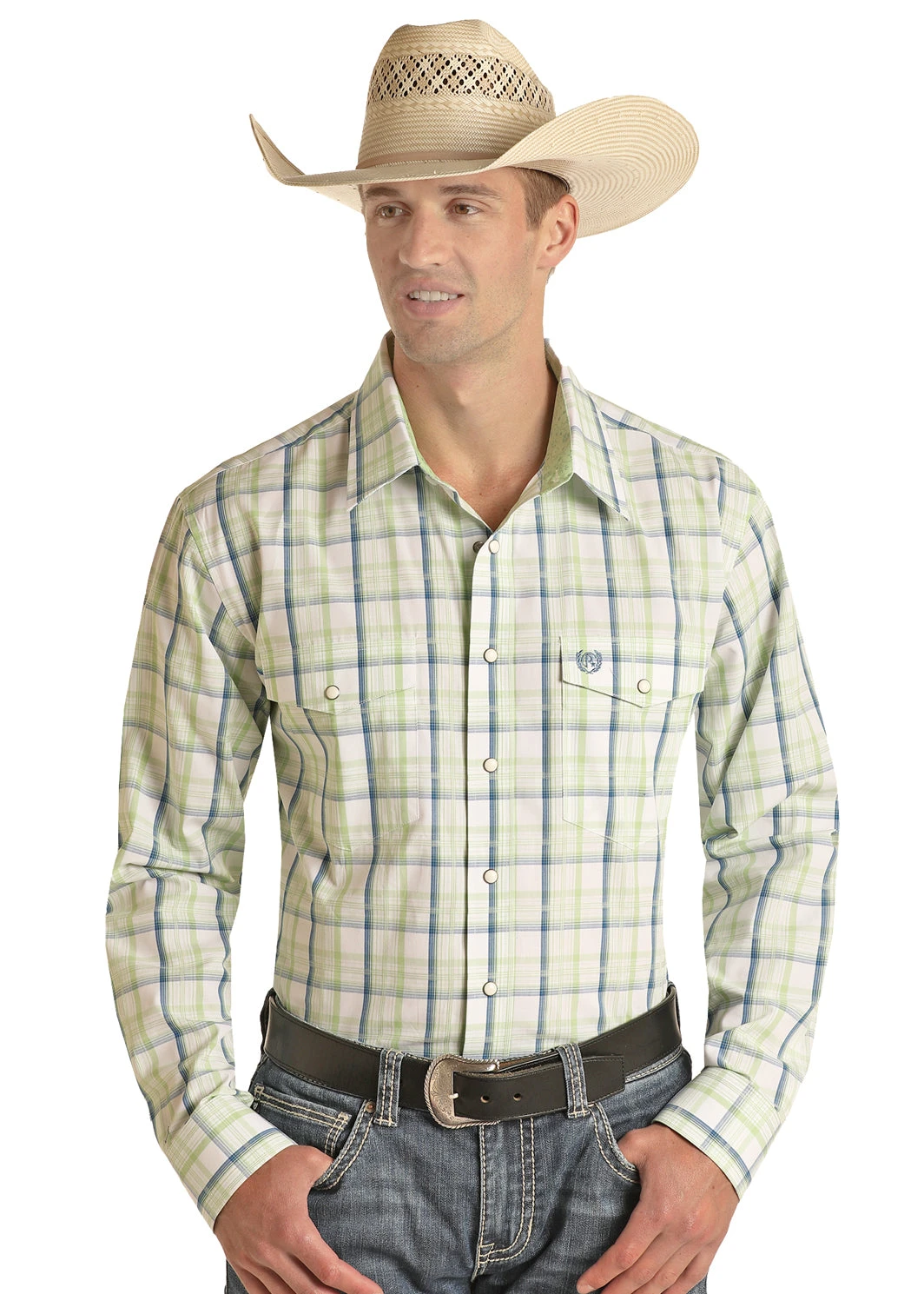 Green, Blue and White Plaid Long Sleeve Snap Front Shirt.