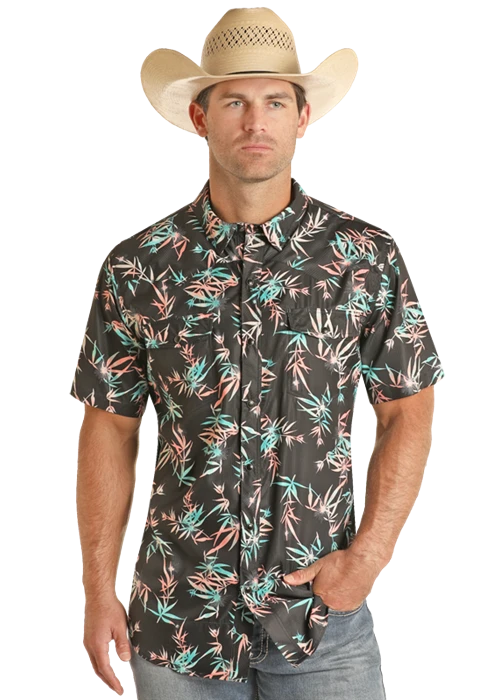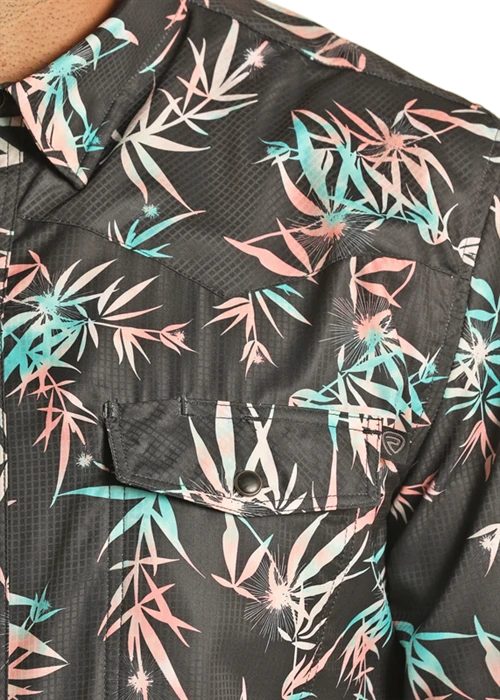 Black with Coral and Teal Tropical Print Short Sleeve Ripstop Snap Front Shirt.