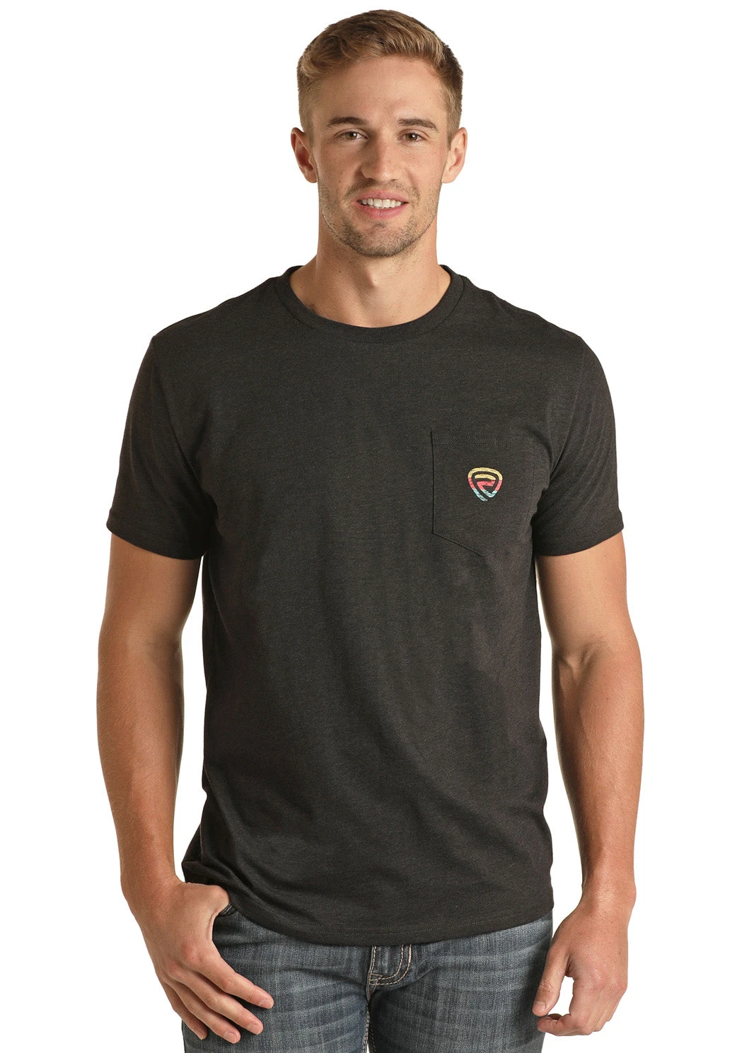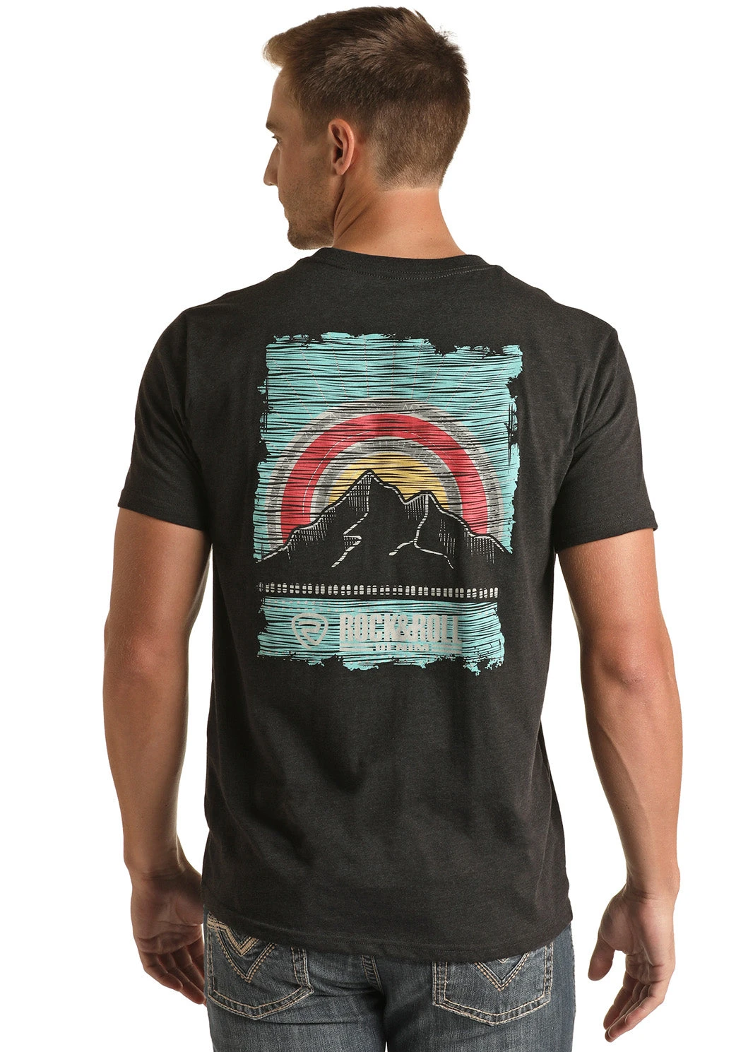 Heather Black Short Sleeve T-Shirt with Mountain Sunset Screen Print on Back.