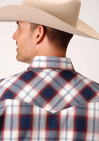 Blue, White and Red Plaid Long Sleeve Snap Front Shirt.