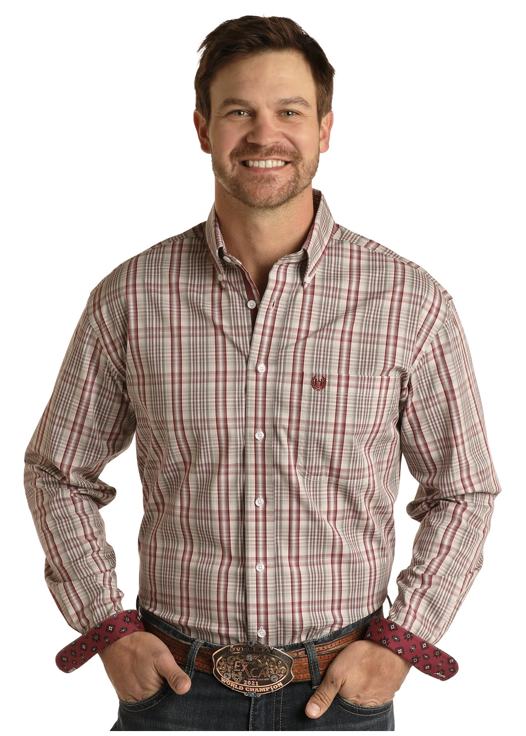 Burgundy and Grey Plaid Long Sleeve Button Down Shirt.