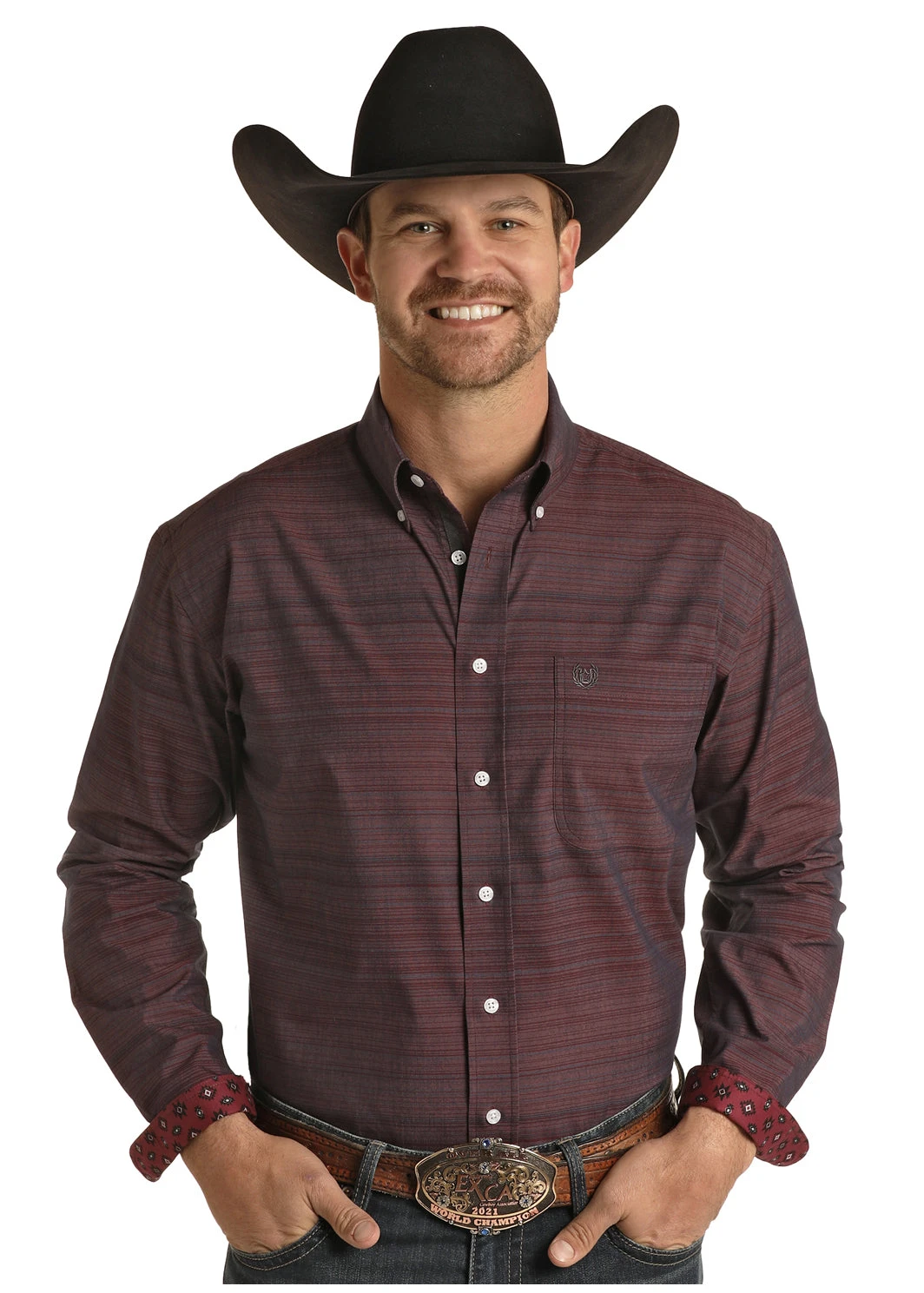 Maroon and Grey Stripe Long Sleeve Button Down Shirt.