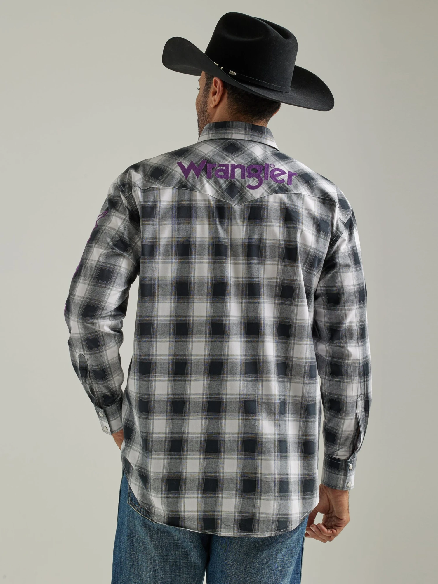 Black and White Buffalo Plaid Long Sleeve Logo Snap Front Shirt.